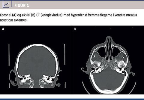 For at udelukke en cerebral årsag til patientens symptomer blev der udført CT af cerebrum, hvor man fandt alderssvarende forhold uden tegn til frisk infarkt, hæmoragi eller rumopfyldende processer. I venstre meatus acusticus externus sås et ca. 7 × 8 mm stort objekt med en CT-værdi på 3.000 HU, hvilket er foreneligt med metal (Figur 1).