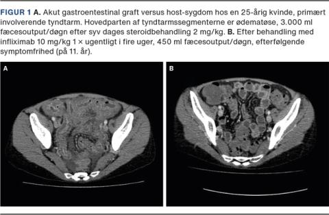 Akut GVHD opstår inden for de første tre måneder efter transplantationen, og oftest er huden involveret, dernæst gastrointestinalkanalen og leveren. På huden udvikles et makulopapuløst eksantem, der i alvorlige tilfælde kan gå over i toksisk epidermal nekrolyse [15]. Gastrointestinalkanalen kan blive svært påvirket med destruktion af epitel, hvilket kan føre til svære diarréer samt væske- og elektrolyttab (Figur 1). Akut GVHD behandles initialt med højdosissteroid, ved terapisvigt tillægges infliximab [16], ruxolitinib [17] eller ekstrakorporal fotoferese [18]. Akut GVHD medfører øget morbiditet og mortalitet i form af infektioner, medicinbivirkninger og organsvigt. Mismatchet donor, høj alder og intensiv konditionering bidrager til øget forekomst af GVHD, men også det fækale mikrobiom er indgået i kliniske studier gennem de seneste år [19]. Der er fundet en sammenhæng mellem et dysbiotisk fækalt mikrobiom med nedsat diversitet, antal genomer og incidensen af akut GVHD. Den kausale sammenhæng er dog ikke påvist endnu, men er et hastigt ekspanderende forskningsområde [20].