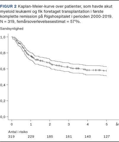 Ved de myeloide sygdomme akut myeloid leukæmi (AML) og myelodysplastisk syndrom er relapsraten 10-40%, afhængig af sygdommens risikoprofil og remissionsgrad før KMT. Som anført vil en mindre grad af immunsuppression med det formål at øge GVL-effekten betyde større risiko for GVHD, og effekten på overlevelse vil derfor udeblive. Det er ikke lykkedes eksperimentelt at separere den immunologiske reaktion, der fører til GVL og GVHD, men i kliniske studier, hvor rekonstitutionen af undertyper af immunceller sammenholdes med de kliniske fund, har man påvist, at specielt solidt engraftment af natural killer-lymfocytter og T-celler med gamma-delta-kæde T-cellereceptor er associeret med mindre GVHD og mindre relaps [23, 24]. Teknisk er det muligt at separere celler i donorgraften, så indholdet af de nævnte celler er dominerende, hvilket undersøges i kliniske studier. I perioden 2000-2020 blev 319 patienter transplanteret for AML i første remission med en femårsoverlevelse på 57% (Figur 2).