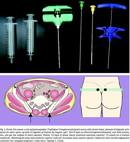 Marvaspiration: Desinficer det planlagte punktursted med jod eller chlorhexidin. Indfør punkturkanylen gennem huden til periosten på spina ilaca posterior superior. Konstater ved at spørge patienten at kanylen faktisk er på det bedøvede område af knoglen. Sigt i retning mod spina iliaca anterior superior. Denne stikretning sikrer adgang til flere cm spongiøst knoglevæv i crista iliaca (Fig. 1). Indfør med en roterende, pressende bevægelse kanylen gennem den kompakte del af knoglevævet og videre 1-2 cm ind i det spongiøse væv, som erkendes ved en »knitrende« fornemmelse i kanylen. Fjern stilletten i kanylen og aspirer 2-3 ml knoglemarv, stryg umiddelbart efter knoglemarven ud på mindst fire objektglas, og fyld resten i en steril beholder til koagulation. Skal der anvendes yderligere marv til udvidede undersøgelser, aspireres 2-3 ml ad gangen ved fornyede punkturer i det bedøvede område. Aspiration af større mængder marv kan øge blodtilblandingen markant og mindske undersøgelsernes kvalitet, medmindre der anvendes perforerede aspirationskanyler.