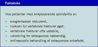 Ankyloserende spondylitis (AS) er en inflammatorisk sygdom, der primært afficerer columna. Knoglemineraldensiteten (BMD) er reduceret, især hos mandlige patienter. Syndesmofytter kan give falsk forhøjede BMD-værdier i columna. Risikoen for vertebrale kompressionsfrakturer er rapporteret at være syvfold øget i forhold til raske individer. Der er ikke beskrevet øget forekomst af perifere frakturer. De strukturelle forandringer i columna disponerer til ustabile frakturer. Der anbefales antiresorptiv behandling af den osteoporotiske patient med AS, men effekten på knoglemassen er aldrig undersøgt hos disse patienter.