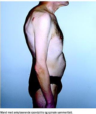 Ankyloserende spondylitis (AS), der forekommer hos 1-2 promille af befolkningen, er en kronisk, systemisk inflammatorisk sygdom af ukendt ætiologi. Sygdommen afficerer først og fremmest det aksiale skelet inkl. sacroiliacaleddene. Den struktur, der primært afficeres, er entesen, som er overgangen mellem senefibre og knogle. Her findes inflammatoriske foci, og der udvikles erosioner. De tidligste radiologiske forandringer i corpora vertebrae er erosioner ved anulusfibrenes tilhæftning (Romanuslæsionen). De reparative forandringer skyder over målet, hvorved der opstår knogleprominenser. På grund af inflammation svarende til fibertilhæftningen på spidsen af knogleprominenserne opstår nye erosive forandringer og nye reparative processer. Til sidst ses næblignende forkalkninger svarende til anulusfibrene - syndesmofytter. Diskus omkranses efterhånden af brodannende syndesmofytter, så der opstår ankolyse. Sekundært kan der optræde ossifikation af disci. Forkalkning af de longitudinelle ligamenter og ydre anulusfibre resulterer til sidst i den klassiske bamboo spine . Lignende processer foregår omkring apofyseleddene og i sacroiliacaleddene. Sygdommen er forbundet med rygsmerter og tiltagende rygstivhed- og krumhed. Hyppigt er der også symptomer fra de større perifere led, fra perifere senetilhæftninger (entesopati) samt ekstraskeletale manifestationer fra især øjne og hud [1, 2].