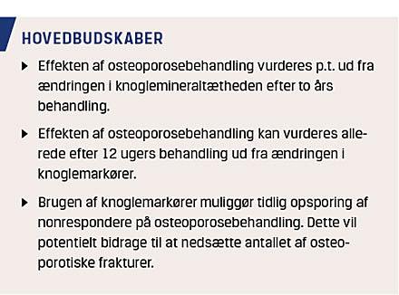 Den ideelle behandlingsmonitoreringstest prædikterer behandlingens effekt på frakturrisikoen, skelner hurtigt og klart respondere fra nonrespondere og er praktisk anvendelig. Flere studier indikerer, at de behandlingsinducerede ændringer i BMD, s-CTX og s-PINP kan prædiktere bisfosfonaters effekt specielt på den vertebrale frakturrisiko. Studierne er heterogene, og i mange har man ikke undersøgt den egentlige prædiktive værdi af BMD-/KM-ændringerne, idet frakturer, som opstår imellem baseline- og followupmålingerne, generelt medinddrages i analyserne. Der er behov for yderligere studier, hvor der tages højde for dette, og hvor den prædiktive værdi af BMD-/KM-ændringer sammenlignes head to head.