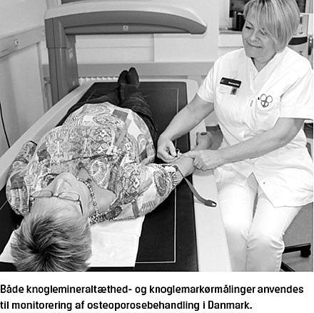Der er internationalt ikke opnået enighed om, hvordan patienter, som begynder i osteoporosebehandling, skal monitoreres. I Danmark monitoreres behandlingen primært via gentagne målinger af knoglemineraltæthed (BMD), som måles via dual-energy X-ray absorptiometry (DEXA). Kun i mindre omfang monitoreres behandlingen med gentagne målinger af knoglemarkører (KM), som måles via automatiserede assays. Det er typisk ændringen i BMD og KM efter behandlingsstart, som anvendes til at vurdere det initiale behandlingsrespons.