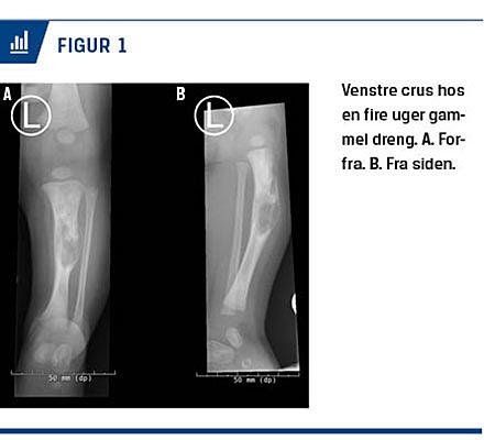 Ved undersøgelsen fandt man drengen i god trivsel. Hofterne bevægedes frit og uømt, og Ortolani- og Barlowtest var negative. På hans venstre underben sås en lille bule, der var øm ved palpation. En ultralydskanning af hofterne viste normale forhold. En røntgenoptagelse af venstre underben viste en tumor, der fyldte det meste af tibia. Tumoren fremstod malignitetssuspekt (Figur 1), og blev foretaget en MR-skanning, hvis resultat fortsat gav mistanke om en mulig malign tumor. Der var en gennemgående fraktur i hele det suspekte område.