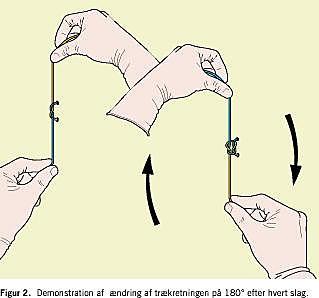 Uanset om man vælger en- eller tohåndsknudeteknik eller instrumentanlagt knudeteknik, tilstræbes råbåndsknuden(Figur 1A ). Denne knude er den mest knudestabile [1, 2] og anbefales som standard til såvel åben som laparoskopisk kirurgi. Råbåndsknuden fremkommer ved, at den samme tråd holdes på samme side ved begyndelsen af hvert slag, og at trækretningen for hver tråd efter hvert slag skifter 180° (Figur 2 ). Knuden strammes til ønsket tension på første slag, idet de efterfølgende råbåndsslag ikke yderligere kan stramme det første slag.