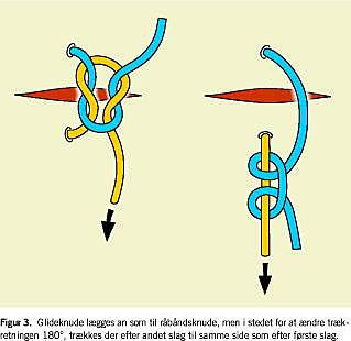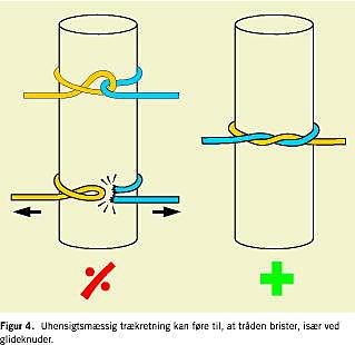 Lægges der an til en råbåndsknude, og princippet med en ændring af trækretningen på 180° efter hvert slag ikke respekteres, ved at man, som det ofte ses, efter hvert slag trækker til den samme side, fremkommer glideknuden (Figur 3 ). Glideknuden muliggør, at knuden strammes yderligere til på andet slag. Da den i forhold til råbåndsknuden er mindre knudestabil [1, 2], må knuden sikres, ved at den enten omdannes til en råbåndsknude, ved at trækretningen ændres 180°, eller ved at der afsluttes med en supplerende korrekt udført råbåndsknude. En væsentlig ulempe ved glideknuden, som kræver flere slag for at opnå knudestabilitet, er, at især tyndere tråde har tendens til at knække (Figur 4 ) et særdeles uønsket forhold, hvis dette sker som afslutning på en fortløbende sutur svarende til en anastomose eller lukning af bugvægsfascien.