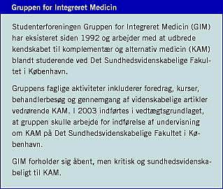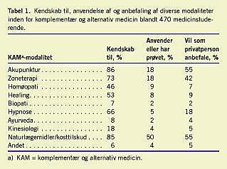 Summary Knowledge and perceptions of complementary and alternative medicine among medical students in Copenhagen, Denmark Ugeskr Læger 2008;170(48):3941-3945 Introduction: Medical faculties worldwide are integrating courses on complementary and alternative medicine (CAM), accepting that knowledge of population's health behaviour, including CAM, increases physicians' ability to communicate, councel and treat their patients. The aim of this survey was to assess attitudes towards and knowledge of CAM, and to determine if medical students at the University of Copenhagen perceived a need for education on CAM. Material and methods: Self-administered questionnaires were distributed among 508 students on 1st, 2nd, 4th, 6th, 8th and 10th semester. A total of 470 questionnaires were included. Results: In all, 94% reported knowledge of one or more CAM modalities, 34% reported knowledge of more than five. Most were acquainted with, had tried and would recommend the modalities herbal medicine/supplements, acupuncture and reflexology. Females were more CAM-positive than males and older students were less positive than the aggregate average. The students showed poor knowledge of the general population's use of CAM. Conclusion: A surprisingly large part of the medical students in Copenhagen reported knowledge and use of CAM compared with other countries, and with the general population, and the students are generally positive towards CAM. The majority agrees that physicians need to possess basic knowledge of CAM, and that courses on CAM should form part of the curriculum.