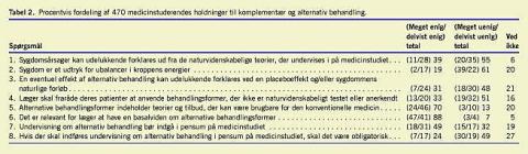 Der ses en overvejende accept af effekten af alternative behandlingsformer samt disses berettigelse og anvendelighed som supplement til konventionel medicin. Dette er i overensstemmelse med andre undersøgelser [10, 12]. Vi forventede, at de studerende ville være mere skeptiske overfor KAM, bl.a. fordi KAM i undervisningen fremstilles hvis ikke direkte negativt så i det mindste som unødvendigt. Det tyder således på, at de studerende er mindre påvirkelige i deres holdninger end ventet og i højere grad forlader sig på egne erfaringer.