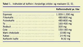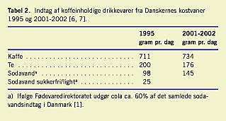 I Danmark har vi i mange år sammen med vores nordiske naboer toppet listen over kaffedrikkende nationer. I Levnedsmiddelstyrelsens undersøgelse fra 1995 af danskernes kostvaner [6] er kaffe klart den drikkevare, som den voksne befolkning indtager mest af hver dag (711 g pr. dag) (Tabel 2 ). Omregnet betyder det, at alle danskere over 15 år i gennemsnit og alene fra kaffe (filter- og pulverkaffe) indtager 340-570 mg koffein hver dag, afhængigt af hvor stærk kaffen er brygget. Dertil kommer bidraget fra te, cola og andre koffeinholdige levnedsmidler.
