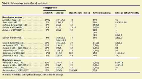 En gennemgang af studiers undersøgelse af koffeins akutte indvirkning på blodtrykket er fremstillet i Tabel 3 opdelt på normotensive og hypertensive individer. Der er stor individuel variation i, hvilke reaktioner koffeinindtagelse inducerer i de biologiske processer, idet der er forskel på individers sensitivitet over for koffein. Dette afspejles i de store interindividuelle forskelle på det akutte respons på blodtrykket, der ses i flere studier [11, 18, 19, 26, 27]. Af tabellen fremgår det dog, at koffeinindtagelse i mange eksperimentelle undersøgelser er forbundet med en stigning i blodtrykket hos normotensive personer, mens blodtrykket i enkelte forsøg ses at være uforandret. Den koffeininducerede stigning varierer mellem 2 mmHg og 10 mmHg, men der eksisterer ikke noget dosis-respons-forhold mellem koffeinindtagelse og stigningen i blodtrykket.