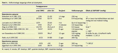Betydningen af et vedvarende koffeinindtag for blodtrykket er vist i Tabel 4 . Resultaterne af de forskellige undersøgelser giver ikke entydige svar. Det spænder fra en negativ sammenhæng mellem koffeinindtagelse og blodtrykket [28, 29], over ingen forandringer [23, 30], til at langvarig koffeinindtagelse resulterer i forøget blodtryk [28, 31, 32, 34]. Undersøgelserne er hovedsagelig foretaget på normotensive og i langt mindre grad på hypertensive personer. Derfor foreligger der for hypertensive relativ lidt information - og igen med modstridende resultater - om, hvilken betydning koffeinindtagelse har for blodtrykket [35, 36]. Samme divergerende observationer er også resultatet af de to tidligere reviews af den langvarige indflydelse af koffein på blodtrykket [26, 37].