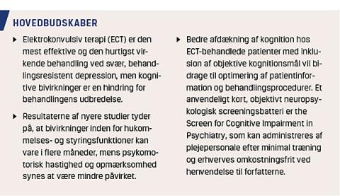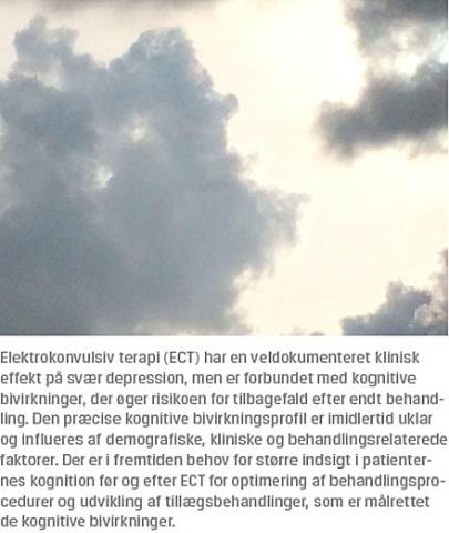 Elektrokonvulsiv terapi (ECT) blev introduceret i 1930’erne og anvendes i dag til behandling af svære psykiatriske lidelser, herunder behandlingsresistent depression og psykotiske lidelser [1]. Behandlingen er imidlertid kontroversiel pga. kognitive bivirkninger og offentligt stigma. Formålet med denne artikel er at karakterisere de kognitive bivirkninger af ECT og belyse de metodemæssige udfordringer i undersøgelsen af kognition hos ECT-behandlede patienter.