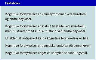 Kognitive forstyrrelser karakteriseres som kernesymptomer ved skizofreni. Ca. tre fjerdedele af patienterne har forstyrrelser i mindst to kognitive domæner [1, 2]. Selv om næsten en fjerdedel derfor kognitivt fungerer inden for normalområdet, er der evidens for, at denne gruppe fungerer på et niveau, der er lavere end forventet ift. deres potentielle funktionsniveau [3]. Når kognitivt potentiale estimeres (ved f.eks. læseprøver og ved maters uddannelsesniveau), har man i studier fundet, at så mange som 98% af skizofrene patienter har et lavere kognitivt funktionsniveau end forventet [4]. De forstyrrede kognitive domæner spænder vidt, fra tidlig informationsbearbejdning (automatiske sensoriske gating -funktioner), forarbejdningshastighed og opmærksomhed til verbal og nonverbal indlæring, langtidshukommelse og arbejdshukommelse, eksekutive funktioner (planlægning, selvmonitorering, fleksibilitet), social kognition og generel intelligens. Der er betydelig variabilitet mellem patienter mht. profilen af forstyrrelserne, der på gruppeniveau oftest er global [5], men også med fremtrædende forstyrrelser i visse afgrænsede domæner, bl.a. indlæring og hukommelsesfunktioner (mht. sværhedsgrad) [6] og eksekutive funktioner (mht. prævalens) [1, 7].