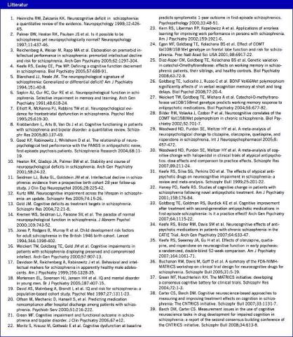 Kognitive deficit er kernesymptomer ved skizofreni, der er stabilt til stede hele sygdommen igennem fra debuttidspunktet og ofte også i mildere form i præmorbide faser. De er kun svagt korrelerede med psykopatologiske symptomer og karakteriserer patienterne uanset klinisk tilstand.