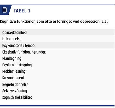 Depression er en af de hyppigst forekommende psykiske sygdomme, og 3-4% af den danske befolkning lider af depression [1]. Endvidere er livstidsprævalensen estimeret til 17-18% [2]. Sygdommen har stor betydning for den fremtidige arbejdsevne og livskvalitet [3]. En essentiel faktor ved arbejdsevne og livskvalitet er kognitive færdigheder, som ofte er forstyrret under og efter en depression. Disse forstyrrelser kan være en sårbarhedsfaktor for selve udviklingen af depression, men det er også påvist, at de kognitive forstyrrelser kan være udløst af depression og forværres ved gentagne sygdomsepisoder [4].