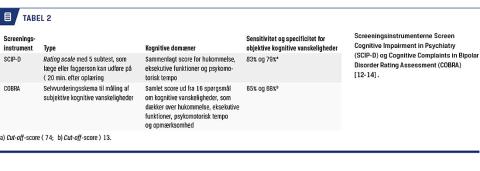 Alternativt kan man benytte to screeningsinstrumenter, der er oversat til dansk og oprindeligt er udviklet til at teste kognitive forstyrrelser hos patienter med bipolar lidelse, men nu er undersøgt hos patienter med unipolar depression [12]. Det ene er Screen Cognitive Impairment in Psychiatry (SCIP-D), der er en rating scale, som lægen skal udfylde – det er derfor et mål for objektive kognitive funktioner. Screeningsredskabet er en god, valid metode til detektering af kognitive forstyrrelser (Tabel 2). Det kræver et par timers oplæring at kunne anvende SCIP-D.