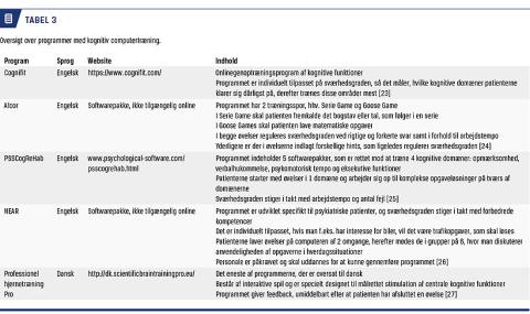 Kognitive funktioner kan forbedres ved kognitiv computertræning. Det er vigtigt, at den kognitive computertræning er tilrettelagt individuelt, alt efter hvilke kognitive funktioner patienten oplever vanskeligheder med, da den påviste effekt hænger sammen med træning af det specifikke område [22]. Der er udviklet flere forskellige programmer til formålet, hvoraf Professionel Hjernetræning Pro er den eneste, der er oversat til dansk (Tabel 3).