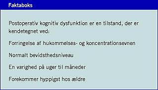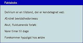 Delirium er en forbigående tilstand, som er særdeles hyppig hos ældre indlagte patienter, hvor hyppigheden er op mod 50% [1]. Tilstanden delirium (akut organisk psykosyndrom jvf. den internationale sygdomsklassifikation ICD-10) kan diagnosticeres ud fra den såkaldte confusion assessment method (CAM) [2]. Den består af fire komponenter: (1) akut opstående og fluktuerende forløb, (2) nedsat opmærksomhed, (3) usammenhængende tankegang og (4) ændret bevidsthedsniveau. Patogenesen ved delirium er dårligt belyst, men delirium synes at optræde som en uspecifik reaktion på talrige højest forskellige former for påvirkning af hjernen. Der kan være tale om lokale forstyrrelser, f.eks. vaskulære og infektiøse cerebrale sygdomme, men også om systemisk påvirkning f.eks. som følge af farmaka, dehydrering og abstinens. Ud over stigende alder er der en række andre risikofaktorer for udvikling af postoperativ delirium, såsom type af kirurgi (høj risiko ved operation for hoftenær fraktur), forudbestående cerebral sygdom (f.eks. demens) og alkohol- eller medicinmisbrug. Derudover er det vigtigt at være opmærksom på andre faktorer, der kan udløse delirium. Ud over kirurgi og anæstesi drejer det sig blandt andet om forstyrrelser i væske- elektrolytbalancen, hypoksæmi, manglende mobilisering, uhensigtsmæssig medicinering og utilstrækkelig smertebehandling. Hospitalsmiljøet er formentlig også af stor betydning, hvorfor en instituering af rolige omgivelser formentlig kan mindske problemet. Behandlingen af delirium retter sig primært mod ophør af udløsende faktorer og er hovedsagelig symptomatisk, mens medicinering fortrinsvis anvendes til svære tilfælde.