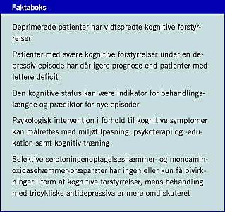 Sammenfattende kan deprimerede patienter altså have mange og vidtspredte kognitive forstyrrelser, som påvirker deres dagligdag i udpræget grad [6].