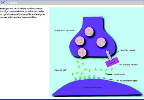Kokain øger det adrenerge respons ved at blokere noradrenalin-re-uptake i den præsynaptiske nerveende. Herved øges udbuddet af noradrenalin til den synaptiske kløft med øget stimuli på de postsynaptiske adrenerge receptorer (Figur 1 ). Karrene i ileum og colon indeholder talrige α-adrenerge receptorer, hvorfor disse tarmsegmenter formentlig er specielt udsatte for iskæmi efter kokainindtag [1].