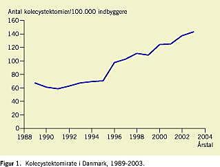 Resultater: Der ses en jævn stigning i kolecystektomiraten gennem perioden fra 67 operationer pr. 100.000 indbyggere i 1989 til 143 operationer pr. 100.000 indbyggere i 2003 (p < 0,05). Øgningen skyldes især de laparoskopisk udførte indgreb, og disse udgjorde i 2003 81% af indgrebene. Andelen af patienter, der blev opereret for akut kolecystitis, faldt fra 14% i 1996 til 12%