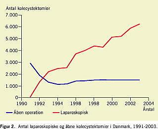 Materiale og metoder: Der er anvendt dataudtræk fra Landspatientregisteret, hvor antallet af kolecystektomier udført pr. kalenderår i 1989-2003 på de forskellige offentlige sygehuse i Danmark blev opgjort. Der blev udført et separat udtræk for åben operation og laparoskopisk operation. Samtidig blev antallet af operationer udført for akut kolecystitis i perioden 1996-2003 opgjort.