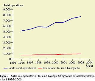 I undersøgelser fra Danmark, Norge, Skotland og Sverige er det fundet, at det totale antal kolecystektomier er steget 15-20% fra introduktionen af den laparoskopiske operationsmetode til midten/slutningen af 1990'erne [7-10], idet det er vigtigt at bemærke, at kolecystektomiraten inden for de skandinaviske lande er meget forskellig fra ca. 6 pr. 10.000 indbyggere i Norge og Danmark til ca. 12 pr. 10.000 indbyggere i Sverige [11]. I en norsk undersøgelse fra 2004 kan man samstemmende med denne undersøgelse påvise, at kolecystektomiraten fortsat stiger og en dnu ikke synes at have nået et stabilt niveau [12].