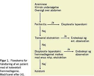 Har man mistanke om perforation, foretages der en akut eksplorativ laparotomi med antibiotika og tromboseprofylakse efter vanlige retningslinjer. Hvis man ved laparotomi finder perforation af colon, foretages der kolotomi med fjernelse af fremmedlegemet og evt. et lille tarmsegment, hvor perforationen er sket. Mange patienter har selv foretaget udrensning forud for introduktionen af fremmedlegemet [7, 8], og nogle gange kan det være muligt at lave en primær anastomose. Er der forurening af bughulen, anbefales det at anlægge kolostomi med blindlukning af det anale tarmsegment. Hvis man ikke finder perforation, kan man forsøge at malke fremmedlegemet mod anus med henblik på transanal ekstraktion, således at en kolotomi undgås. Alternativt foretages en kolotomi med fjernelse af fremmedlegemet. Her kan det ligeledes være muligt at foretage primær anastomose.