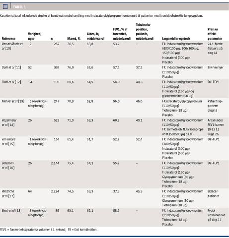 Der er publiceret ni studier (6.166 deltagere) (Tabel 1). Alle deltagere var stabile, men symptomatiske, og opfyldte de spirometriske kriterier for moderat til meget svær KOL. Alle studier var randomiserede, kontrollerede studier sponsoreret af et enkelt medicinalfirma (Tabel 1). I to studier sammenlignede man fast kombination af ind/gly med ind (og placebo), i et studie med ind og gly, i to studier med tiotropium (tio) (og placebo), i et studie med fastkombination af salmeterol/fluticason (salm/flu), i et studie med ind, gly og tio (og placebo) og i et studie med placebo.
