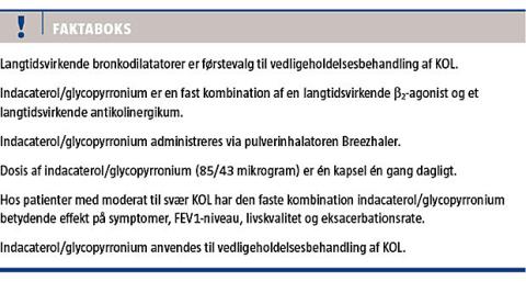 Den faste kombination af de langtidsvirkende bronkodilatatorer ind og gly er, baseret på de foreliggende undersøgelser, sikker og godt tålt og har hos patienter med moderat til meget svær KOL klinisk betydningsfulde effekter på symptomer, inkl. dyspnøscore, livskvalitet, FEV1-niveau og sandsynligvis også hyppigheden af eksacerbationer. Det er sandsynligt, at samme effekt kan opnås ved behandling med den frie kombination af de to lægemidler [12], men den faste kombination antages at have en positiv effekt på adhærens.