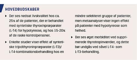De foreliggende data tyder på, at kombinationsbehandling med L-T4 og L-T3 kan have klinisk effekt hos en lille undergruppe af patienter, skønsmæssigt 5-10%, og kan anvendes uden risiko, hvis overbehandling undgås. Det er dog ikke muligt med vores nuværende viden a priori at afklare, hvilke patienter med hypotyreose som muligvis kunne have gavn af kombinationsbehandling med L-T3 og L-T4.