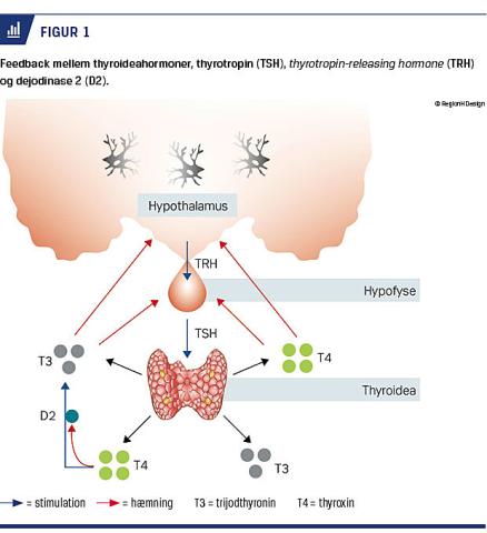 Hypotyreose (nedsat produktion af thyroideahormoner (thyroxin (T4) og trijodthyronin (T3)) er en hyppigt forekommende sygdom i Danmark [1] og er oftest betinget af en autoimmun sygdomstilstand i glandula thyroidea. T4 dannes udelukkende i glandula thyroidea. For T3’s vedkommende er 20% af det i blodet cirkulerende T3 dannet i glandula thyroidea, mens 80% opstår ved dejodering af T4 i perifert væv – uden for glandula thyroidea [1] (Figur 1). Affiniteten af T3 til nukleære receptorer er ca. ti gange højere end af T4.