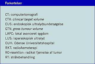 Alle patienter havde histologisk eller cytologisk verificeret adenokarcinom i pancreas og LAPC. Patienterne blev vur-deret på Kirurgisk Afdeling A, OUH, med henblik på resekt-abilitet. Tumoren blev defineret som LAPC, hvis der ved udredning med EUS og/eller laparoskopi samt LUS blev fundet indvækst i omgivende organer; samt ved okklusion af eller indvækst i v. porta, v. cava, aorta, a. eller v. mesenterica su-perior, truncus coeliacus eller a. hepatica. Forstørrede lymfeknuder tæt på primærtumoren udelukkede ikke præoperativ strålebehandling (RT), hvis lymfeknuden kunne inkluderes i strålefeltet.