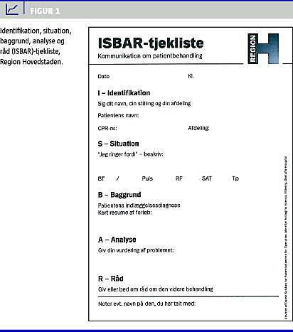 I flere år har en ISBAR/SBAR(ISBAR uden identifikation)-tjekliste været til rådighed (Figur 1 ). Tjeklisten har vist sig at øge kvaliteten og klarheden af telefonsamtaler og øge personalets kommunikationsegenskaber [4, 5]. Selv om kun de færreste kan påstå, at de ikke har hørt om den før, er det sparsomt, hvor mange der rent faktisk anvender den. Det kan undre, fordi huskelisten ellers skulle gøre samtalen både hurtig, sikker, struktureret og forudsigelig. Derudover viser det sig, at når den først er implementeret, finder personalet den gavnlig [6]. I flere undersøgelser har man desuden påvist, at anvendelsen øger patientsikkerheden og patientsikkerhedsklimaet [6-8].