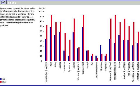 Anvendelsen af tjeklisten blev overordnet markant forbedret og især de overordnede principper skal fremhæves, idet angivelsen af informationerne i den rigtige rækkefølge blev mere end fordoblet til næsten 80% (p = 0,0063), selv om ikke alle var undervist i brugen.