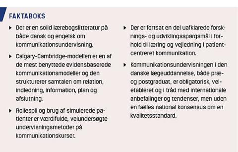 Den internationale litteratur afspejles i den danske, hvor kommunikative færdigheder fremstilles som afgørende for patientkontakt, patientsikkerhed og behandlingsresultater [17-19]. Det er tilsvarende også undersøgt, hvilke undervisnings- og prøveformer der kunne egne sig i en dansk kontekst [20-22]. Men man kan endnu ikke konkludere, om én bestemt model er den »bedste«, hverken i Danmark eller internationalt [23]. Det er derfor også vigtigt at forstå, hvordan kommunikationsundervisningen i Danmark har udviklet sig, og hvilke praktiske erfaringer man har indhentet.