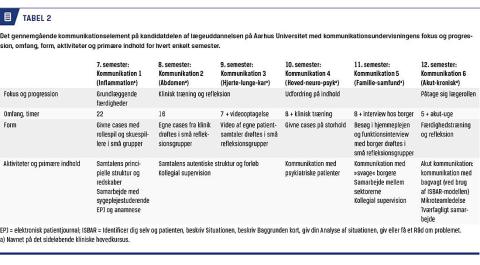 Op igennem 1980’erne blev kommunikationsundervisning en integreret del af lægeuddannelserne internationalt, og i Danmark fulgte man gradvist med. Nu indgår kommunikationstræning i undervisningen på alle universiteterne i Danmark, og for alle gælder, at der undervises på både bachelor- og kandidatniveau med curricula, som er fordelt over flere semestre (Tabel 1). Fælles er også en metodisk prioritering af praktiske øvelser og eksperimentel træning med fokus på den kliniske anvendelighed. De danske kandidatuddannelser følger dermed den forskningsmæssige viden om effektiv organisering af medicinsk kommunikationsundervisning. Calgary-Cambridge-modellen anvendes på hovedparten af uddannelserne, og temaerne for under-
