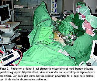 Operationen blev foretaget i generel anæstesi og epidural-anæstesi i Th10-11. Tromboseprofylakse i form af tinzaparin 3.500 IE og TED-strømper blev anvendt. Operationen varede 290 minutter og blev udført i lavt stensnitleje med patientens ben hvilende i standardlægbøjler foret med trykabsorberende indlæg kombineret med Trendelenburgs leje (Figur 1 ). Operationen kompliceredes af, at tumoren var vokset fast på blæren, ureteres og bugvæggen, hvorfor der peroperativt blev