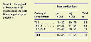 I litteraturen synes kompensatorisk svedtendens at være beskrevet som en mere permanent bivirkning efter sympatektomi. Hyppigheden varierer imidlertid betydeligt på trods af et ensartet operativt indgreb. De fleste beskriver bivirkningen hos 30-70% af patienterne. Kun i ganske få studier er der skelnet mellem varierende grader af kompensatorisk svedtendens efter sympatektomi. Vores resultater viser, at kompensatorisk svedtendens er en hyppig bivirkning efter torakoskopisk sympatektomi. Den forekom hos 89% af patienterne og hos 35% i et sådant omfang, at de ofte måtte skifte tøj i løbet af dagen. Imidlertid accepterede flertallet af patienterne åbenbart denne bivirkning, eftersom de fleste svarede, at de havde opnået et godt eller tilfredsstillende resultat efter operationen. 16% fortrød indgrebet, men dette tal er formentlig højere, da 4% ikke returnerede spørgeskemaet. Vi fandt ingen signifikant forskel mellem omfanget af sympatektomi og hyppigheden af kompensatorisk svedtendens. Til gengæld fandt vi, at den svære form for kompensatorisk svedtendens var signifikant hyppigere efter Th2-4-sympatektomi for aksillær svedtendens. Det ser ud til, at denne observation ikke tidligere er beskrevet.