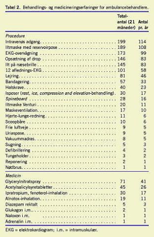 Man kan selvfølgelig diskutere, om nærværende pilotprojekt dokumenterer en tilstrækkelig vedligeholdelse af den enkelte ambulancebehandlers kompetencer. Vi har hos en enkelt ambulancebesætning fundet, at 26 ud af 31 procedurer/medicineringer blev anvendt mindre end ti gange pr. ambulancebehandler pr. år. Heraf blev 15 procedurer/medicineringer anvendt en gang eller færre pr. ambulancebehandler pr. år. Tre af disse procedurer (maskeventilation, hjerte-lunge-redning og sugning) anses for at være rutinekrævende. Angående hjerte-lunge-redning (HLR) som specifik kompetence har man i studier påvist, at denne bør sikres vedligeholdt i form af et kursus hver sjette måned [8]. Allerede to uger efter et kursus i HLR ses et fald i denne kompetence [9]. Det er derfor af stor vigtighed, at visse procedurer, som må anses for at være komplekse og rutinekrævende, opfriskes med jævne mellemrum. Det har endvidere vist sig, at HLR ikke alene kan vedligeholdes sufficient ved hyppig klinisk anvendelse. Her har det vist sig nødvendigt, at man vedligeholder sine evner under grundig supervision og ved brug af simulatordukker med indbyggede indikatorer for korrekt udførelse. Om det forholder sig tilsvarende for de øvrige teknisk krævende procedurer vides ikke, men det er naturligvis nærliggende at antage.