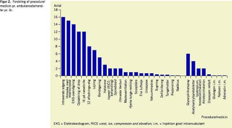 Af Tabel 2 fremgår det, hvor ofte gruppen af ambulancebehandlere har anvendt deres kompetencer gennem pilotprojektet. Figur 2 viser et estimat over procedurernes hyppighed pr. ambulancebehandler pr. år. Det bemærkes, at 26 ud af 31 procedurer/medicineringer anvendes sjældnere end ti gange pr. ambulancebehandler pr. år.