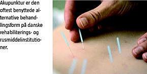 Summary Use of complementary and alternative medicine at Danish rehabilitation institutions and drug centres Ugeskr Læger 2012;174(1):39-41 The study has investigated the use of complementary and alternative medicine (CAM) at Danish rehabilitation institutions and drug centres. Questionnaires were sent to 147 centre leaders at 52 rehabilitation institutions and 95 drug centres. CAM is offered at 37.5% of the rehabilitation institutions and at 61.1% of the drug centres. Twenty-one different CAM modalities were used. Acupuncture and NADA-acupuncture had the highest prevalence. Motives for offering CAM were most often experienced effects within the institution and inspiration from other institutions.
