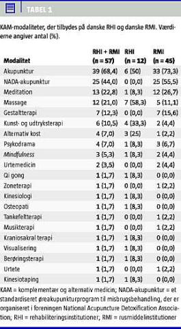 Tre modaliteter blev tilbudt oftere på RHI end på RMI: massage (p < 0,01), alternativ kost (p < 0,01) og kunst- og udtryksterapi (p < 0,01). NADA-akupunktur blev tilbudt signifikant oftere på RMI end på RHI (p < 0,01).