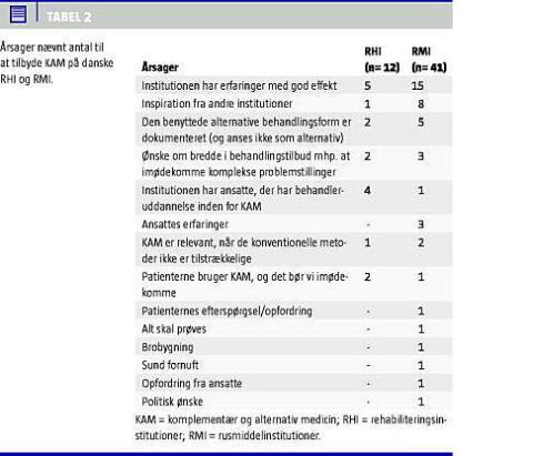 En mulig forklaring på denne relativt hyppige brug af KAM på danske RHI/RMI kan baseres på, at rehabiliteringsområdet generelt kan opfattes som mere individorienteret end sygehusområdet. Rehabiliteringsområdet har i de senere år bevæget sig fra en grundlæggende medicinsk forankring mod en mere psykosocial og sociokulturel opfattelse [9]. Man kan forestille sig, at der i den udvikling er opstået et behov for et endnu bredere behandlingstilbud, der også inkluderer KAM.
