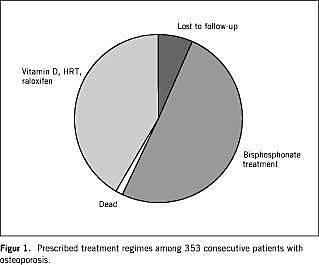 Introduction: In randomized controlled trials, pharmacological treatment decreases the incidence of fractures in women with post-menopausal osteoporosis by 35-65%. Compliance with treatment in these studies has ranged from 50% to 89%; however, the participants in such trials are highly selected and well motivated, and are offered special services and frequent clinical visits in comparison with patients treated in a clinical setting. We studied compliance with bisphosphonate treatment in a consecutive group of patients with post-menopausal osteoporosis referred from general practice to a secondary and tertiary care centre.