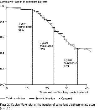 Komplians blev analyseret med Kaplan-Meiers statistik. Dikotome parametre med mulig indflydelse på komplians var analyseret ved hjælp af χ2 -test. Betydningen af alder, BMD og nettoindkomst for komplians blev testet med uparret t-test. Endelig blev komplians i den aktuelle patientserie sammenlignet med andre publicerede studier med t-t est. p-værdier under 0,05 blev anset for signifikante. Alle beregninger blev udført ved brug af SPSS version 10.0 for Windows, og data er vist som middelværdi ± SD eller median (range). Øvrige angivelser er i procent.