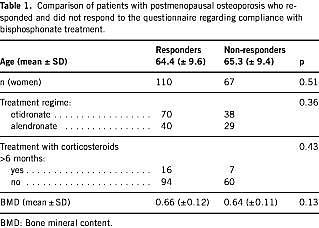 Discussion: Our study confirms that compliance with bisphosphonate treatment is considerably lower in clinical practice than among patients participating in randomized studies. The level of education and adequate information about the treatment are the most important predictors of compliance.