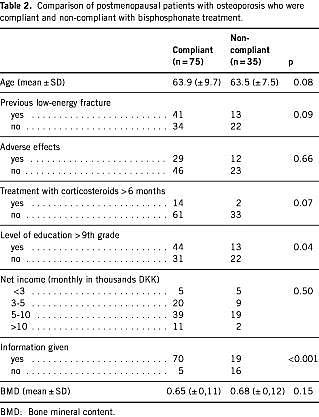 Materials and methods: During the two-year study period, 177 post-menopausal women were diagnosed with osteoporosis and were started on bisp hosphonate. These patients were invited to participate in the present study by letter. A questionnaire comprising 28 items on how, when, and how often the bisphosphonate was taken and a number of other parameters was mailed to each patient together with a stamped return envelope. Non-responders were reminded after two months. In all, 110 patients responded.