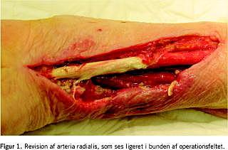 En måned senere blev patienten genindlagt via skadestuen med en ukarakteristisk blødning fra venstre håndled. Man havde på plejehjemmet observeret en rød hævelse over den radiale del af håndleddet, hvilket af vagtlæge og skadestue blev tolket som et ældre hæmatom. Hævelsen blev imidlertid tiltagende rød og spændt, for til sidst at perforere med arteriel blødning. Ved kirurgisk eksploration fandt man et område med, hvad der blev beskrevet som abscesmembraner, men uden synligt pus. Man fandt imidlertid en tydelig defekt af arteria radialis, og arterien blev ligeret. Ved dyrkning af væv fra operationen blev der hverken fundet vækst af aerobe eller anaerobe bakterier. C-reaktivt protein (CRP) var ved indlæggelsen 13 mg/l (normalværdi < 10 mg/l). Ved sekundærsuturering to dage senere blev der ikke fundet tegn til infektion, og patienten blev udskrevet. Ti dage efter udskrivelsen blev patienten genindlagt på mistanke om infektion i cikatricen over håndleddet, og ved fornyet sårrevision observerede man spredte nekroser og fibrin, men igen blev der hverken fundet pus ved eksploration eller bakterievækst ved dyrkning. Der blev på intet tidspunkt givet antibiotika.
